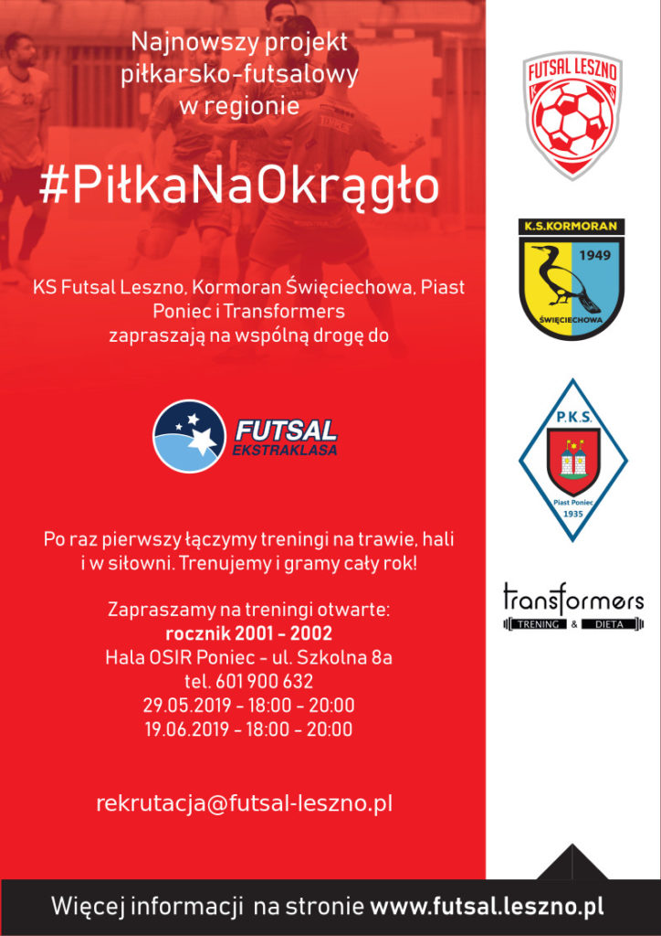 29 maja 11 śmiałków z roczników 2001 i 2002 przekroczyło drzwi nowoczesnej, dobrze wyposażonej i klimatyzowanej hali OSiR w Poniecu aby spróbować swoich sił w treningu futsalowym. Część z nich miała wcześniej styczność z futsalem, dla części to zupełna nowość. Dwóch z nich trenuje piłkę nożną trawiastą w Piaście Poniec, czterech w Kormoranie Święciechowa, jeden w Naszej Dyskobolii Grodzisk a czterech obecnie pozostaje bez klubów. Tym samym projekt o nazwie KS Futsal Leszno U18 w ramach idei #PiłkaNaOkrągło i celu Młodzieżowe Mistrzostwa Polski w Futsalu U18 został oficjalnie rozpoczęty.