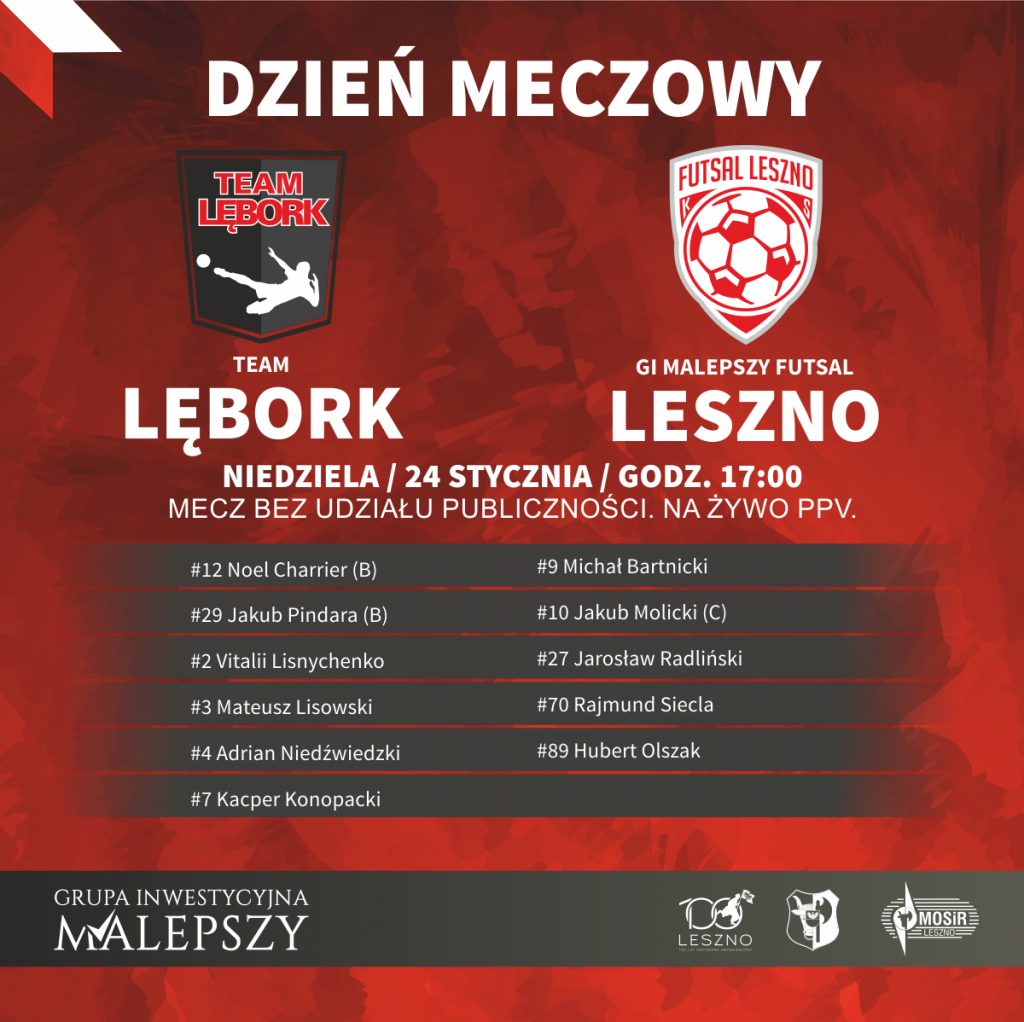 Niedziela 24.01.2021 godz. 17.00 to termin naszego meczu 1/32 Pucharu Polski w Futsalu. Ze spotkania gospodarze przeprowadzą transmisję w trybie PPV, którą możecie obejrzeć tutaj W naszym składzie na to spotkanie zabraknie przebywającego na zgrupowaniu Reprezentacji Polski Sebastiana Wojciechowskiego, oraz leczących drobne urazy Piotra Pietruszko, Jana Martina, Michała Długosza i Bartosza Wojtyniaka