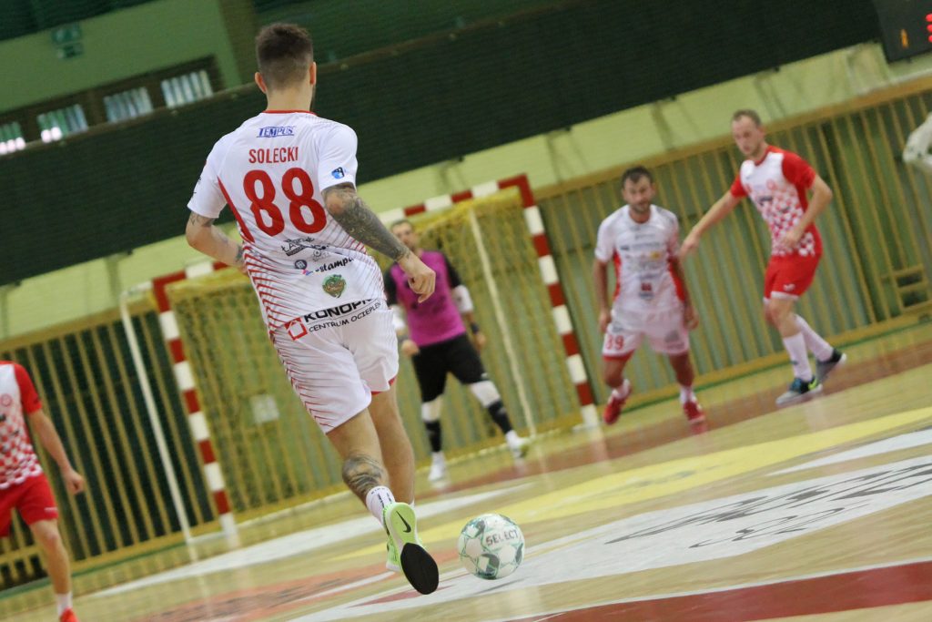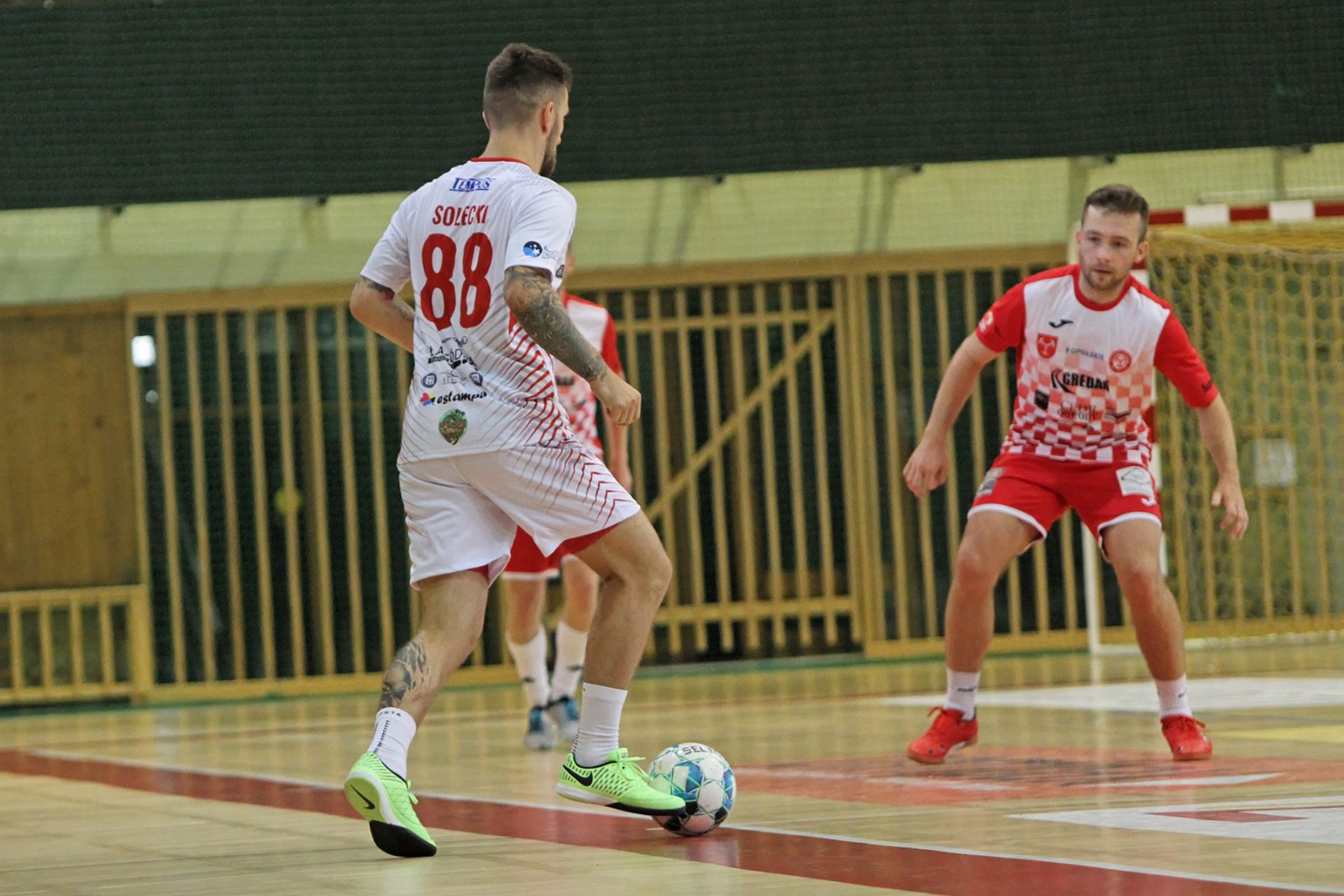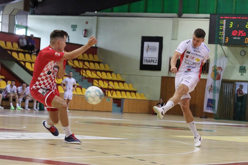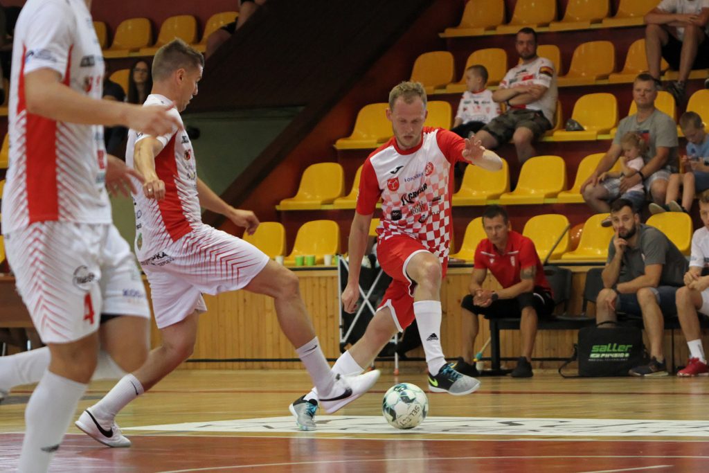 Pierwsze sparingowe spotkanie w Hali Trapez rozpoczęło się o godzinie 12.00 . Rozegrano trzy tercje po 20 minut z zatrzymywanym czasem. W naszym składzie piątka nowych zawodników Jakub Kąkol 11, Douglas Neutzling 32, Dominik Solecki 88 oraz dwaj młodzieżowcy pozyskani z Futsal Gostyń Fryderyk Maciejewski 99, a w bramce z numerem 2 Orfeusz Jarożek. Poza nimi zobaczyliśmy na parkiecie Mateusza Lisowskiego Adriana Niedźwiedzkiego, Kacpra Konopackiego, Piotra Pietruszko, Jakuba Molickiego,  Sebastiana Wojciechowskiego, Rajmunda Sieclę, Huberta Olszaka, a w bramce Noela Charriera