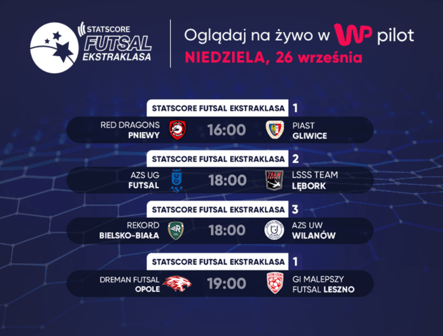 Mecz na żywo obejrzycie w WP Pilot na 1 kanale STATSCORE Futsal Ekstraklasy https://pilot.wp.pl/sport/#statscore-futsal-ekstraklasa-1