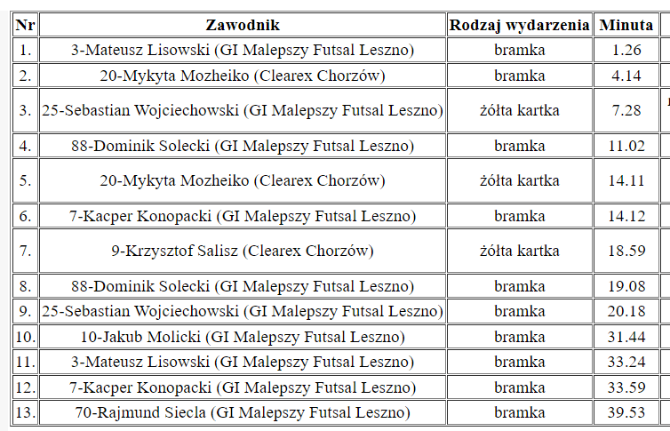 W 2. minucie dwójkowa akcja Wojciechowski Lisowski i prowadzimy 0:1 W piątej minucie rzut karny zamienił na bramkę Mykita Możejko i na tablicy mamy remis 1:1 W 12 minucie kolejną asystę Sebastiana Wojciechowskiego na bramkę zamienił Dominik Solecki. 15 minucie bezpośrednio z rzutu wolnego na 8 metrze trafił Kacper Konopacki . 20 minucie Dominik Solecki ustala wynik pierwszej połowy na 1:4 Fenomelny początek drugiej połowy i w 21 minucie bezpośrednio z rzutu rożnego trafia Sebastian Wojciechowski Od 27. minuty gospodarze grają z wycofanym bramkarzem. W 33. rzut wolny z 6 metra na bramkę zamienia Jakub Molicki. W 34. minucie dopisujemy na konto dwie bramki po przejęciu piłki na połowie boiska najpierw Mateusz Lisowski, a następnie Kacper Konopacki i na tablicy wyników mamy 1:8 Od 36 minucie w naszej bramce Bartosz Wojtyniak. Na 6. Sekund przed końcem wynik meczu ustala Rajmund Siecla i z Chorzowa wieziemy 3 punkty