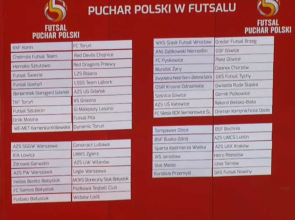 W niedzielę 19.12.2021 odbyło się losowanie 1/32 Pucharu Polski w Futsalu. Los przydzielił nam występujący w grupie północnej 1 PLF Futsal Szczecin. Z dziewiątą drużyną obecnych rozgrywek spotkamy się już 06.01.2022. Wszystkie pary 1/32 znajdziecie na grafice.