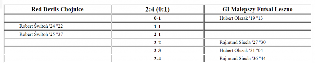 W pierwszej połowie oba zespoły zachowawczo. Na dodatek my po dwóch żółtych kartkach Jakub Kąkola przez dwie minuty gramy w osłabieniu, ale nie tracimy bramki. W ostatniej minucie pierwszej połowy Hubert Olszak, zagraniem klasycznego piwota wyprowadza nas na prowadzenie. W 24. minucie po błędzie w rozegraniu do remisu doprowadzają gospodarze, a w minutę później po kolejnym błędzie po raz drugi trafił Świtoń. W 28 minucie dokładne rozegranie rzutu rożnego przez Sebastiana Wojciechowskiego i do bramki trafia Rajmund Siecla. Kapitalna akcja naszych w 31. minucie – Jakub Molicki do Douglasa, a do bramki trafia po raz drugi Olszak. Od 35. minuty gospodarze rozpoczynają grę z wycofanym bramkarzem, ale po indywidualnej rajdzie drugie trafienie zalicza Siecla i na tablicy mamy 2:4. Mimo gry w osłabieniu w pierwszej połowie, niekorzystnego rezultatu po 25. minutach gry wieziemy z Chojnic trzy punkty.