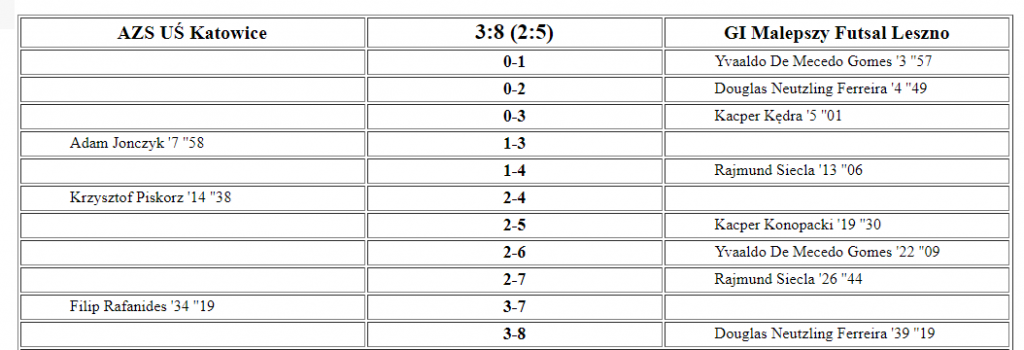 Po czterech minutach spokojnej gry dwójkowa akcja Brazylijczyków i po podaniu Douglasa na raty trafia Yvaaldo. 49. sekund później znowu akcja tych dwóch zawodników w słupek Douglas, w słupek Yvaaldo , dobija to Douglas i mamy 0:2. 15. sekund później Yvaaldo do Kacpra Kędry i mamy 0:3. Trzy trafienia w 64 sekundy !!! 7”59’ strata w strefie obronnej i mamy 1:3. Kilka minut wyrównanej gry oraz naszych niewykorzystanych szans, ale wreszcie na 1:4 w 13”06’ podwyższa Rajmund Siecla po kontrze z Douglasem. Znowu strata na naszej połowie i do bramki trafia kapitan akademików – 2:4. Na 30 sek. przed końcem pierwszej połowy podwyższa Kacper Konopacki, który trafia do pustej bramki po akcji Soleckiego i do szatni schodzimy z trzybramkową przewagą. W 23. minucie indywidualna akcja Yvaaldo, który minął trzech zawodników i podwyższył na 2:6. 26”44’ z rzutu wolnego Yvaaldo do Rajmuda Siecli, a ten strzałem przy słupku z ósmego metra trafia na 2:7. 34”19’ po strzale Rafanidesa 3:7. Na 40 sek. wynik zamyka Douglas technicznym uderzeniem po diagonalnym podaniu Yvaaldo i do Leszna wieziemy komplet punktów.