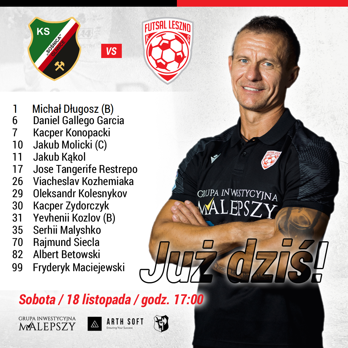 Gramy szybką piłkę od początku i już w 2 min. kontra Jose Tangarife, podanie do zamykającego Rajmunda Siecli i mamy prowadzenie. Kolejne osiem minut to akcje po obu stronach boiska z optyczną przewagą i szansami gospodarzy. Jednak to my podwyższamy. Po długim i dokładnym wyrzucie Evgenija Kozlova do Slavy Kozhemiaki na 6 metr, ten oddaje do Jakuba Kąkola, który z 10. metra zdobywa swoją 11. bramkę w tym sezonie. W 17. min. kombinacyjna akcja – Daniel Gallego dogrywa do Siecli ten oddaje na czystą pozycję do Tangarife i mamy trzybramkowe prowadzenie. Dwie minuty później Kąkol rozgrywa z rzutu wolnego na dziewiąty metr do Kacpra Konopackiego, ten uderza lewą nogą i na tablicy mamy 0:4